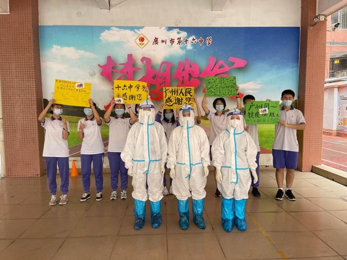 廣州市第十六中學高三考生向醫護人員表示感謝。